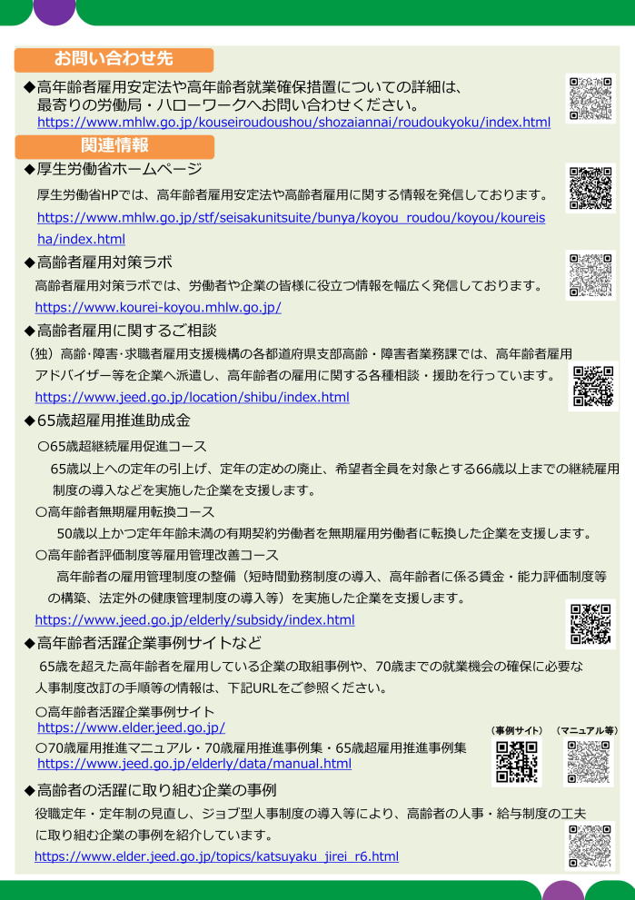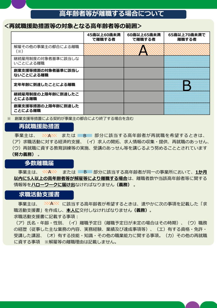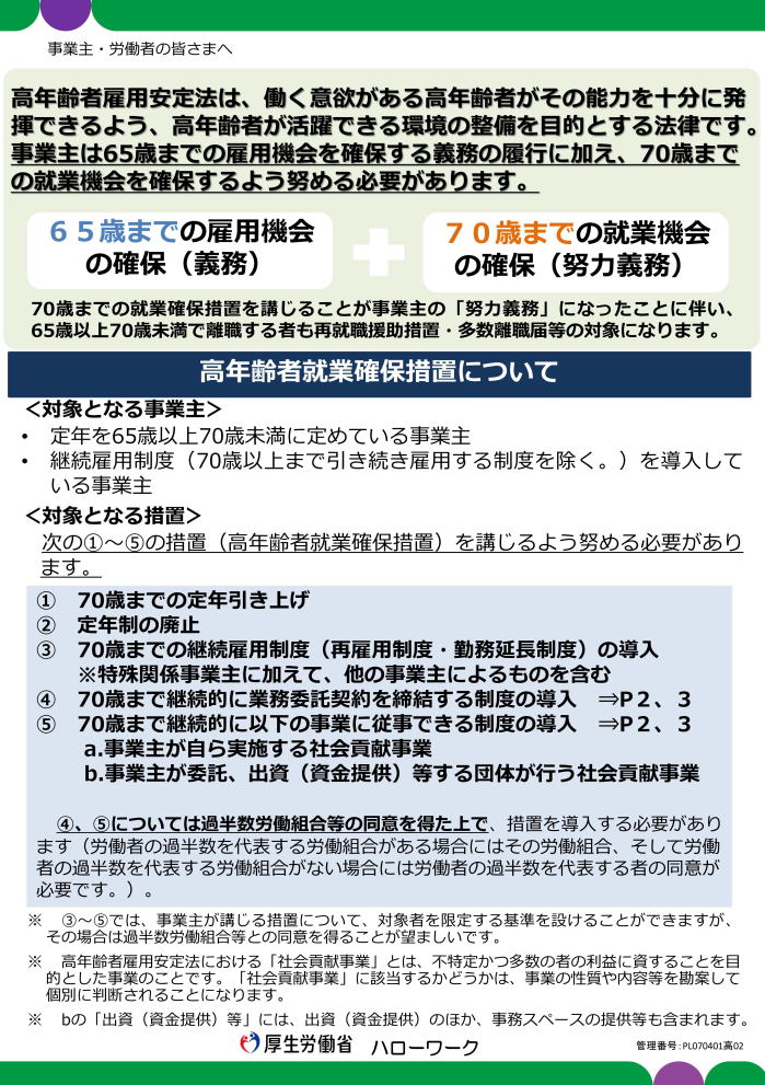 少子高齢化が急速に進展し人口が減少する中で、経済社会の活力を維持するため、働く意欲がある高年齢者がその能力を十分に発揮できるよう、高年齢者が活躍できる環境の整備を目的として、「高年齢者等の雇用の安定等に関する法律」(高年齢者雇用安定法)の一部が改正され、令和3年4月1日から施行されています。